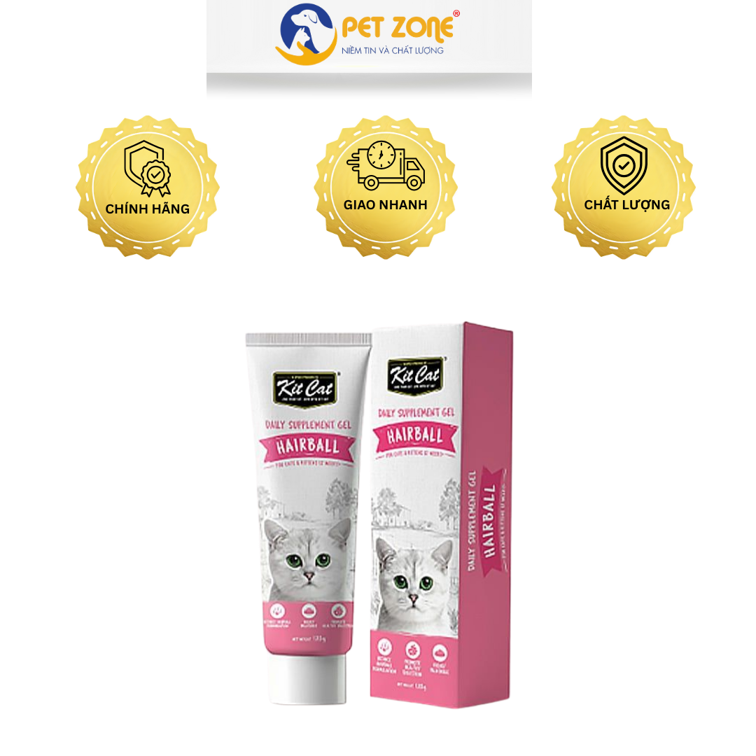Sản phẩm trong ảnh là gel dinh dưỡng hỗ trợ ngừa búi lông cho mèo Kit Cat Daily Supplement Gel Hairball.